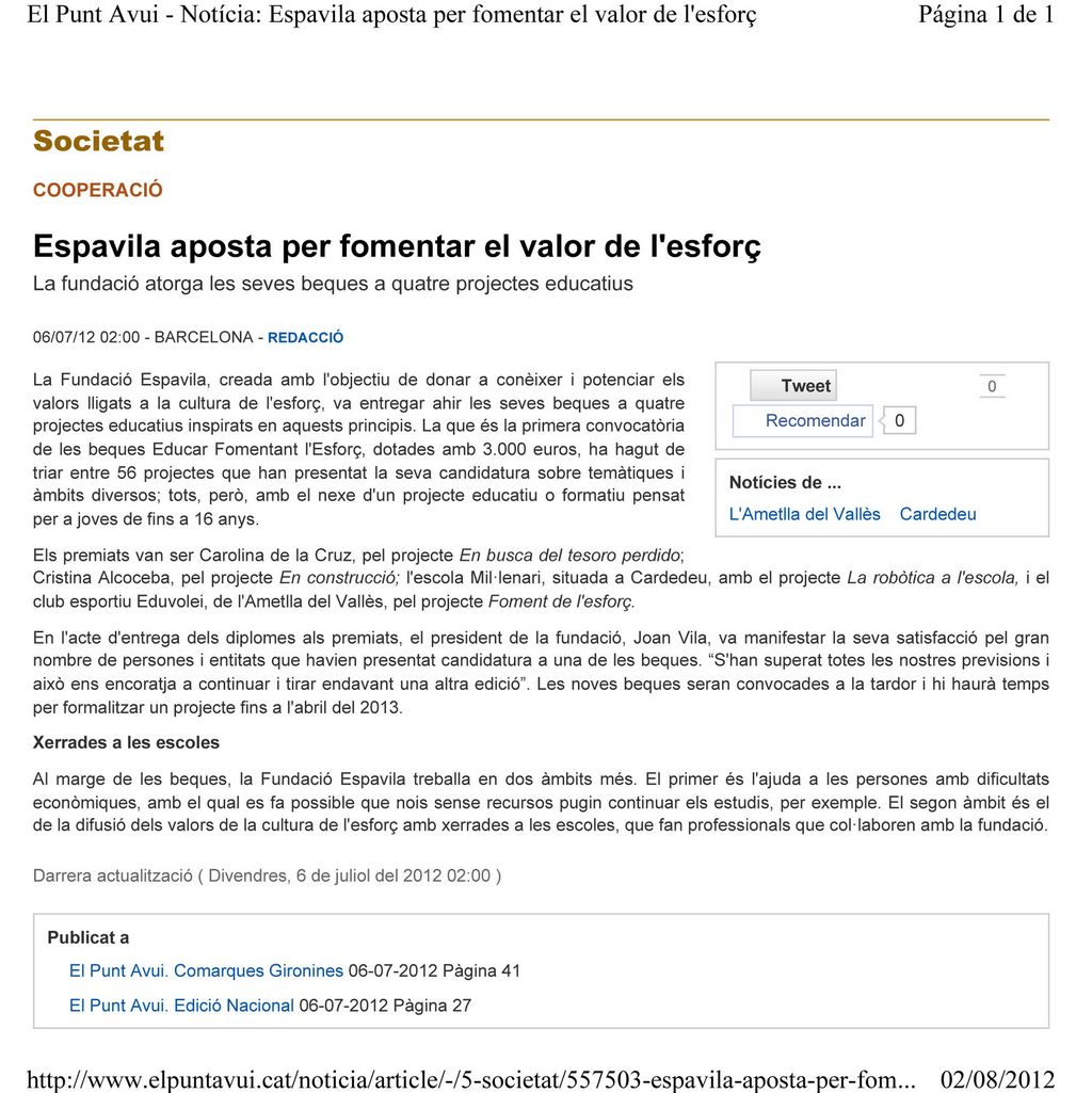 El Punt avui publica un article sobre la Fundació Espavila i les Beques Educar Fomentant l'Esforç.